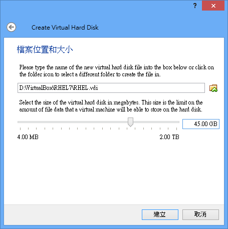 Step 7:檔案存放位置自行設定;配置多少空間給虛擬機,依個人硬碟空間大小設定,完成 後"建立"